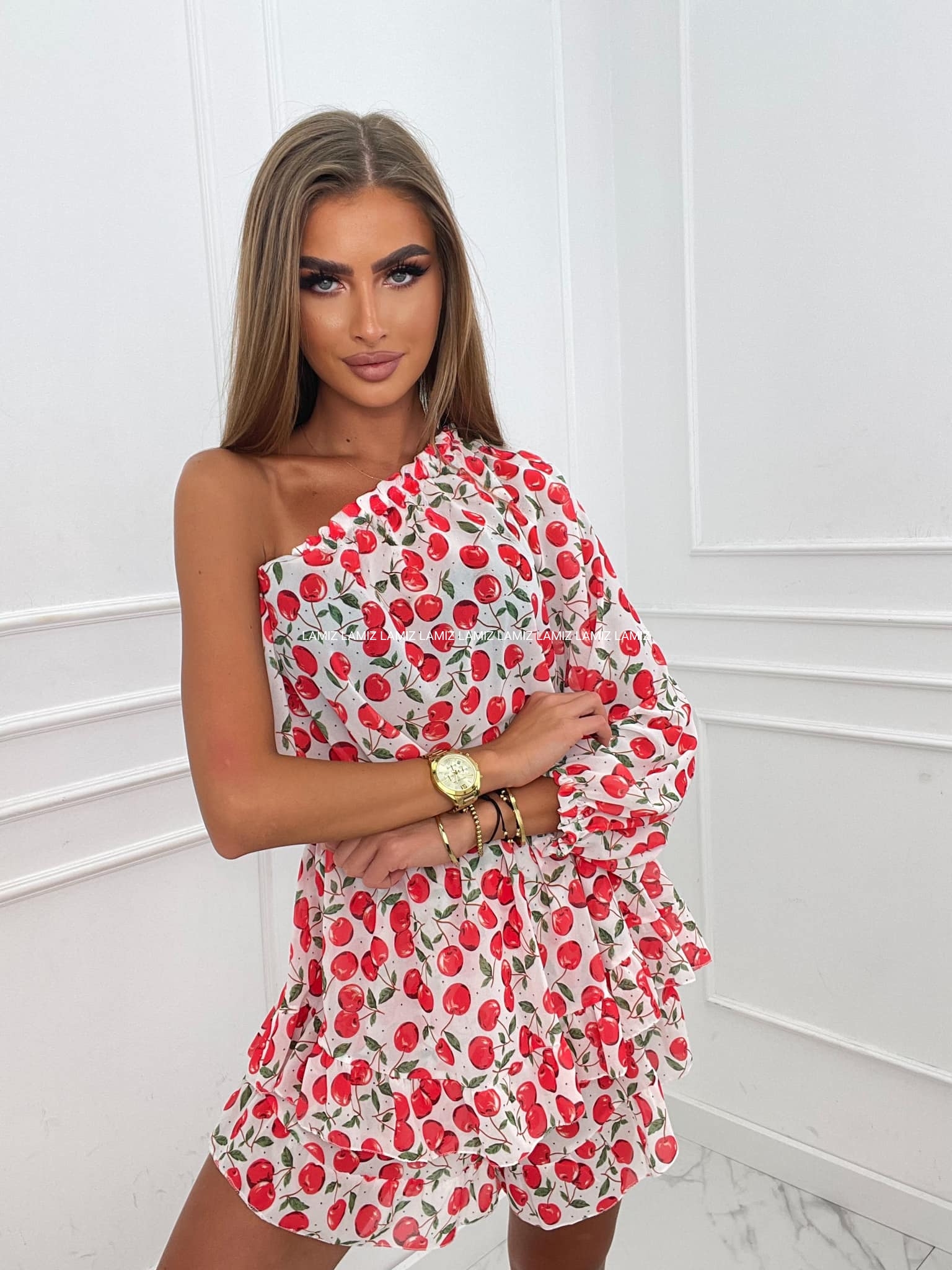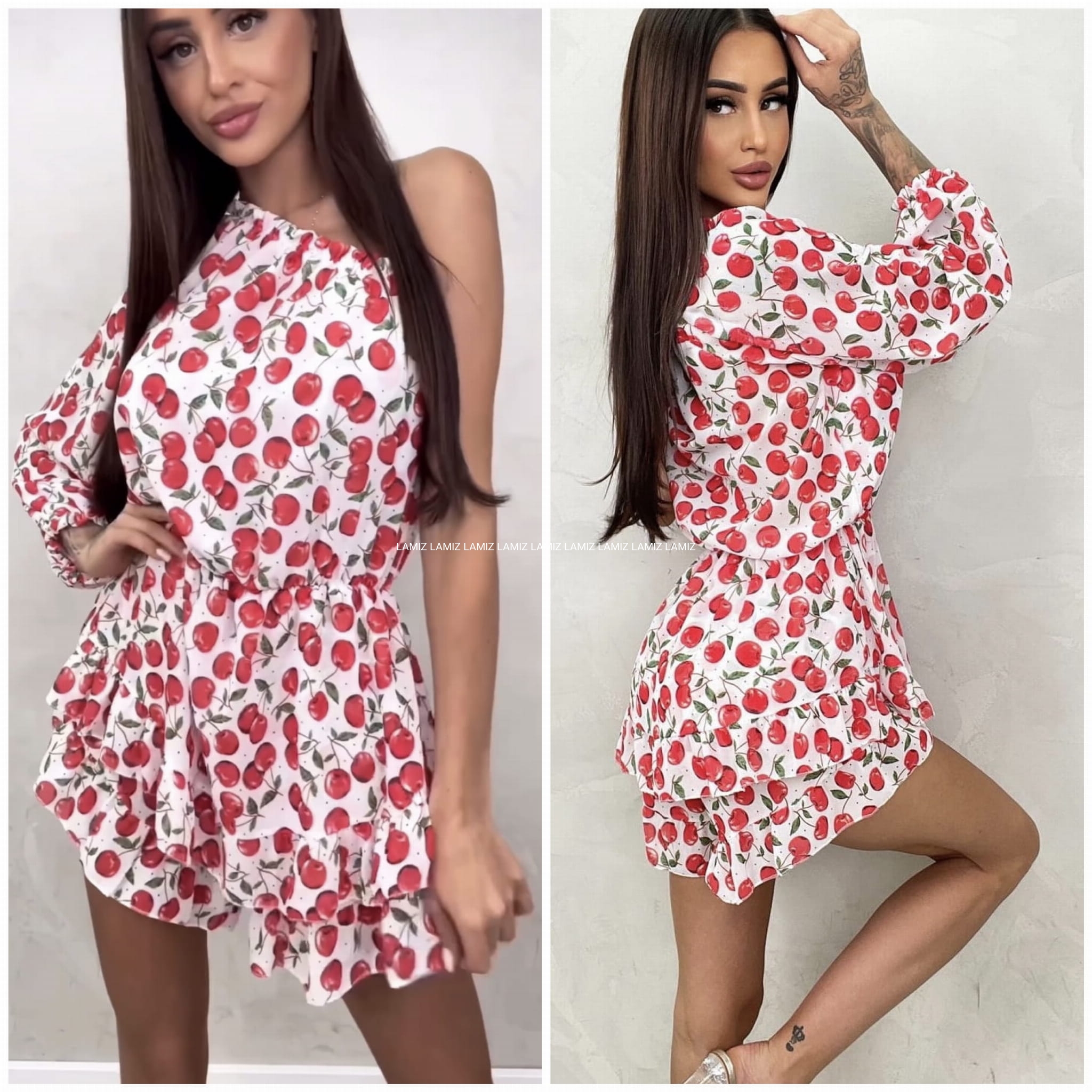 Uroczy kombinezon wykonany z lekkiej, szyfonowej tkaniny z nadrukiem wiśni. Model na jedno ramie, zapewni Ci komfort stylizacji. Posiada elastyczną gumkę w talii. Idealna propozycja na letni look.