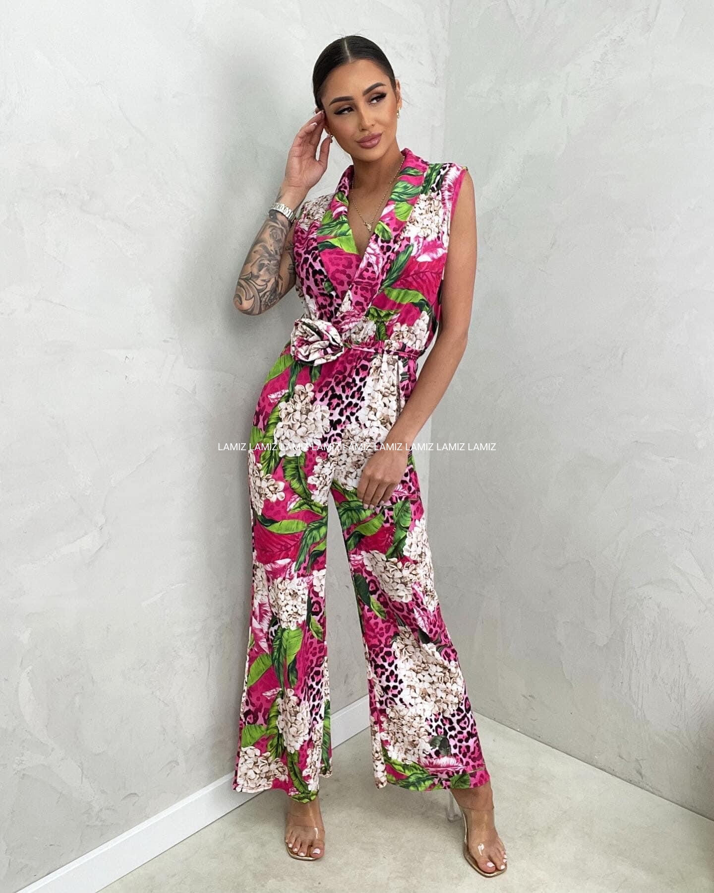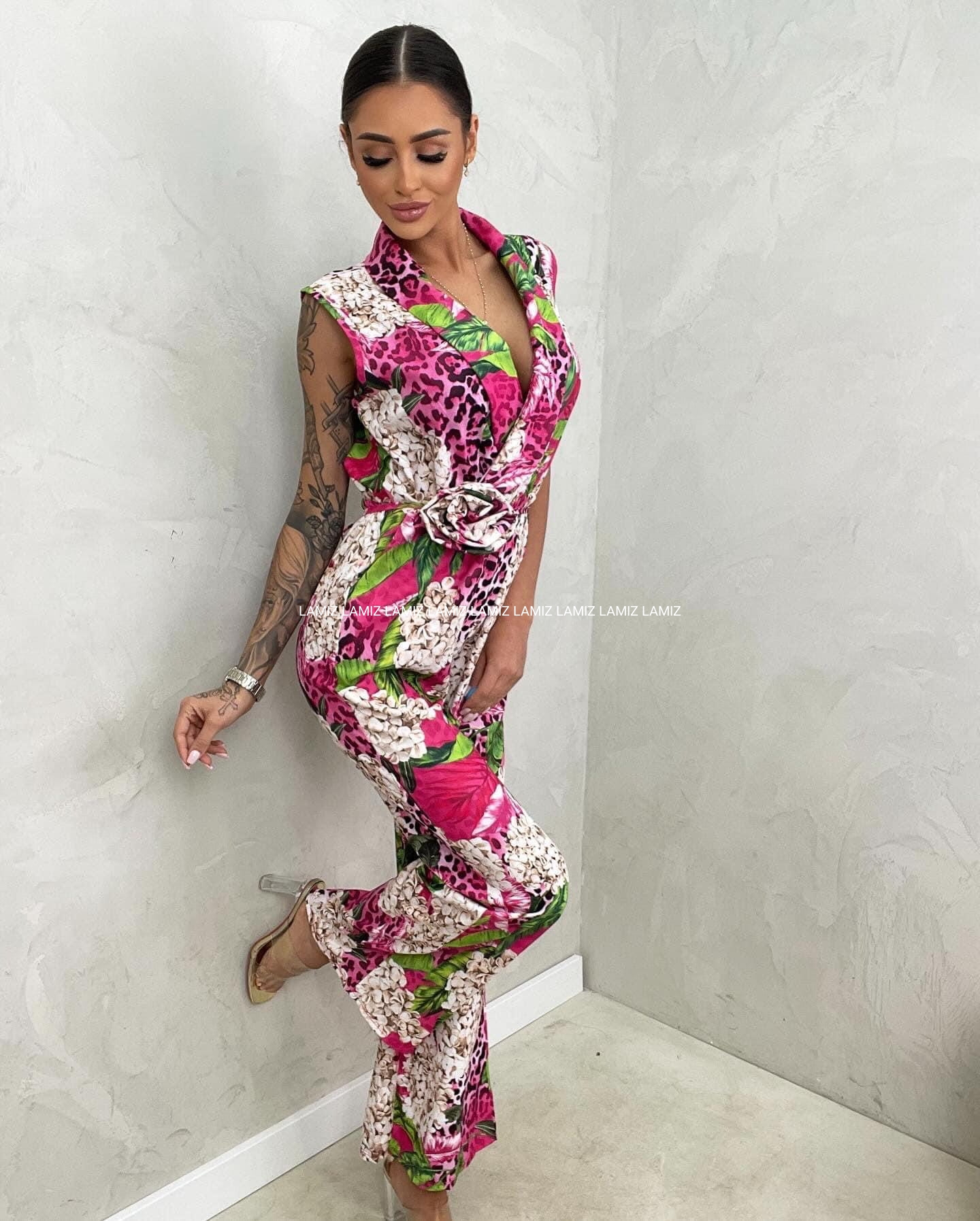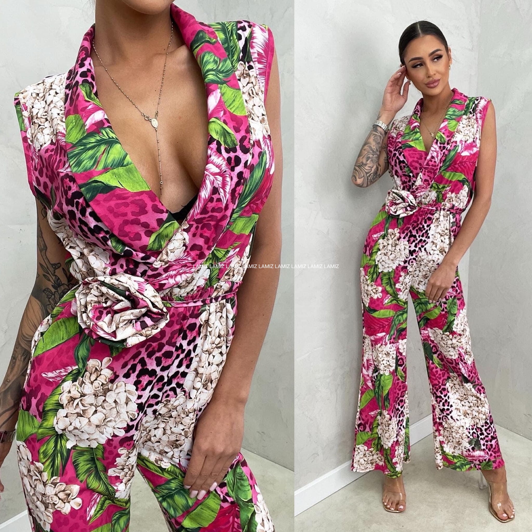 Kombinezon to uniwersalny model, który wykorzystasz na wiele okazji, skompletuj go ze szpilkami i stwórz wyjątkową stylizację na szczególne okazje, bądź oryginalny codzienny look ze sneakersami czy klapkami. Fason z szerszymi nogawkami i chokerem z różą. Głębszy dekolt w serek genialnie podkreśli biust, a wzór z którego jest wykonany doda oryginalność Twojej stylizacji.
