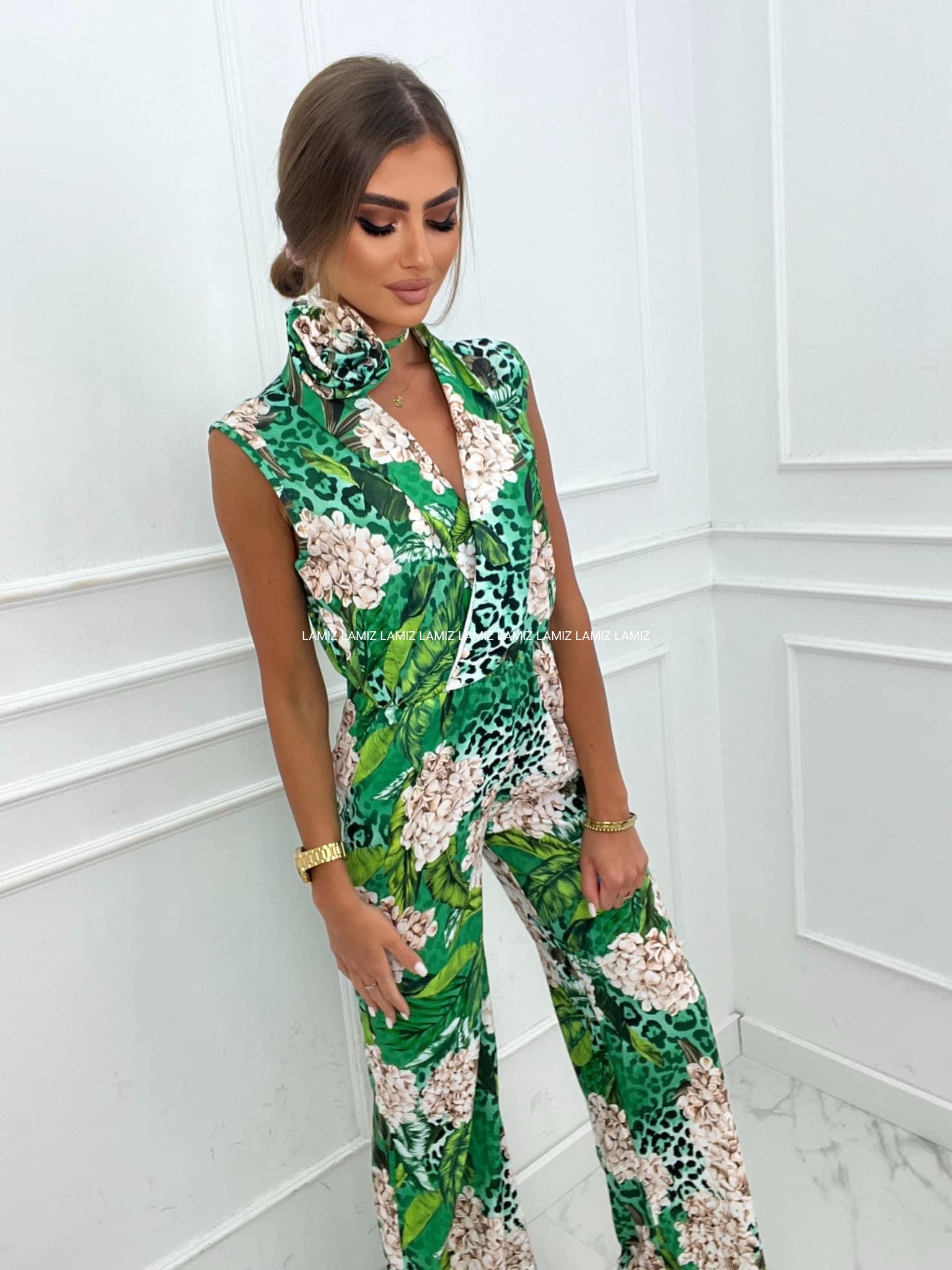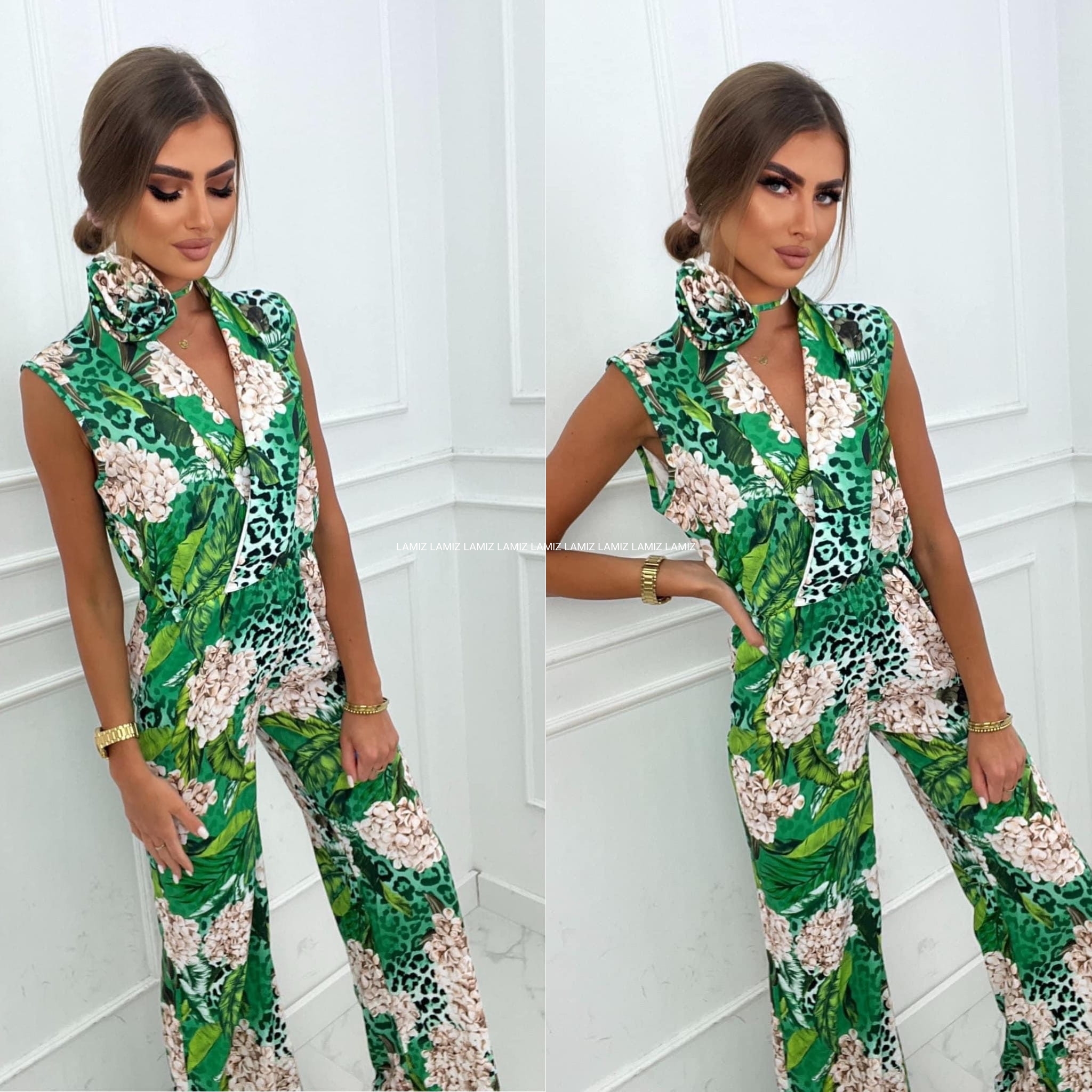 Kombinezon zielony długi kwiaty z chokerem impreza