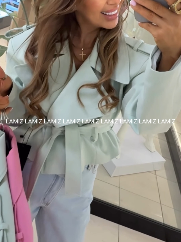 Stylowy, krótki płaszcz w oversize'owym kroju, który zapewnia maksymalny komfort i swobodę noszenia. Wyposażony w pasek do wiązania, podkreśla talię i dodaje sylwetce nowoczesnego charakteru.