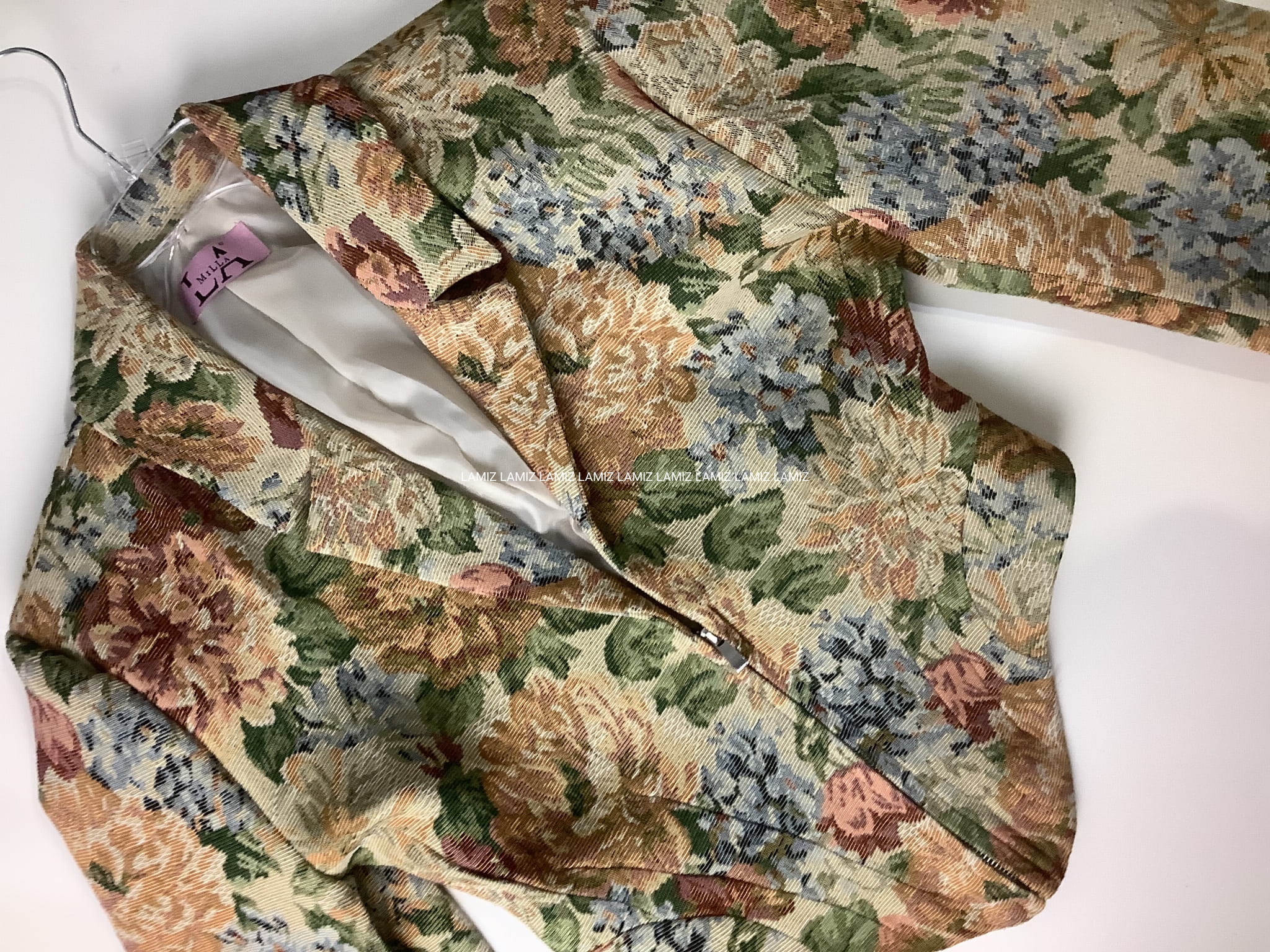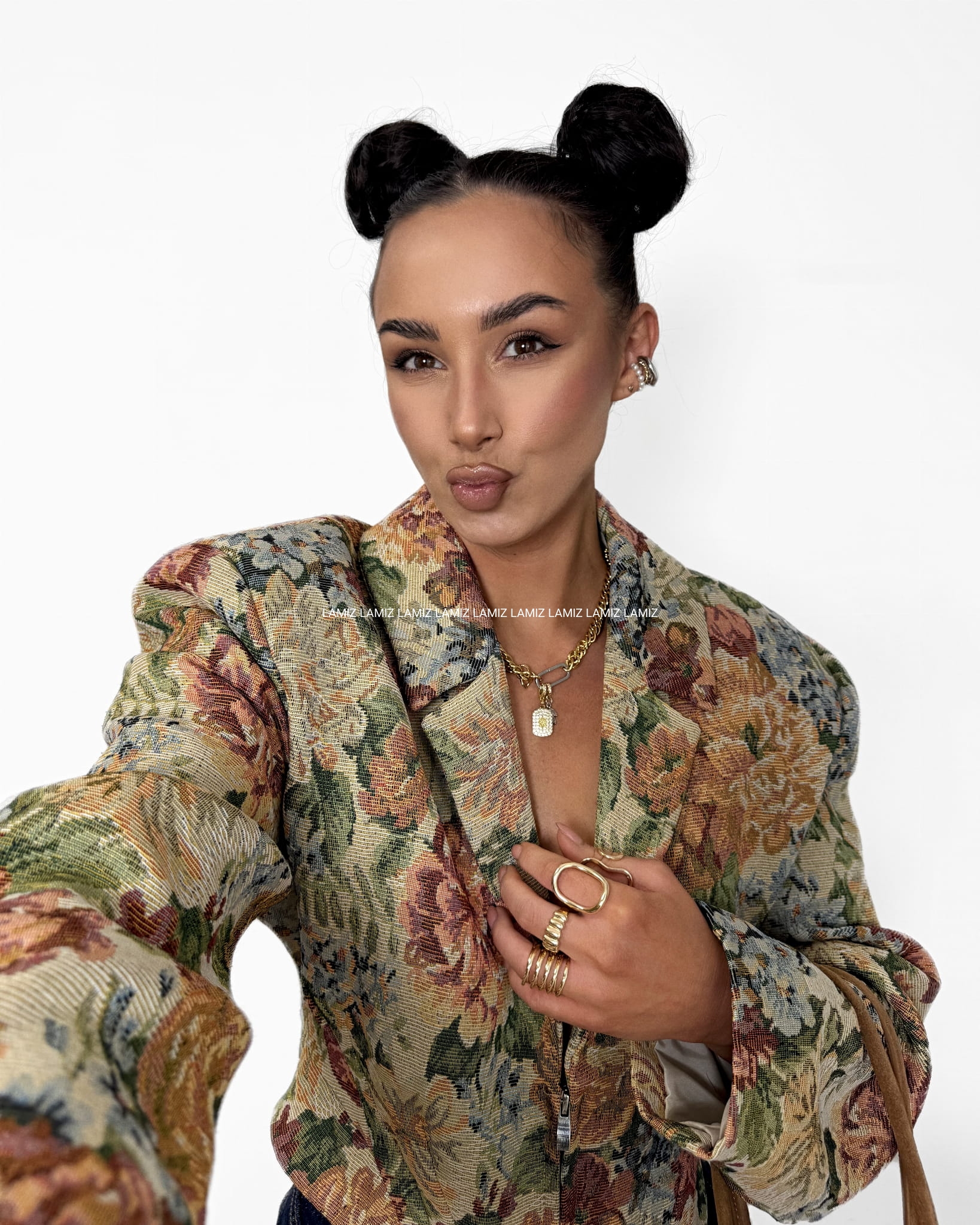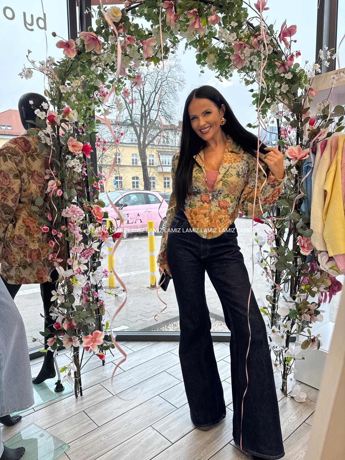 Żakardowa marynarka w kwiatowy print to elegancka i kobieca propozycja, która łączy klasykę z wyrazistym wzorem. Wykonana z wysokiej jakości materiału o strukturze żakardu, prezentuje się luksusowo i efektownie. Marynarka posiada zapięcie na guziki, duże praktyczne kieszenie oraz wiązania w talii, które pozwalają dopasować fason do sylwetki, podkreślając kobiece kształty. Kwiatowy print nadaje całości świeżego, modnego charakteru, dzięki czemu marynarka świetnie sprawdzi się zarówno w stylizacjach casualowych, jak i bardziej eleganckich