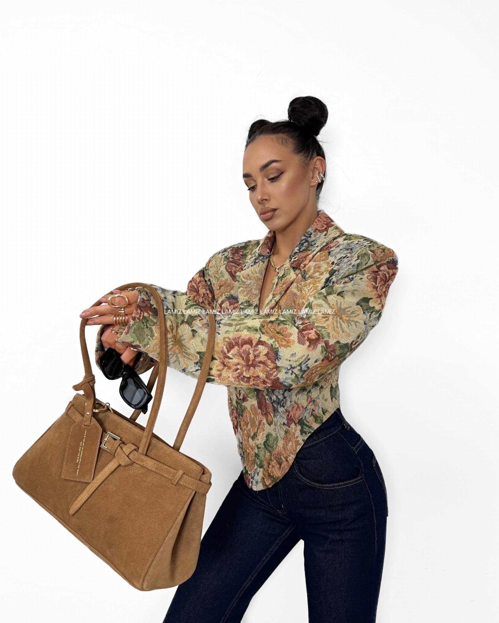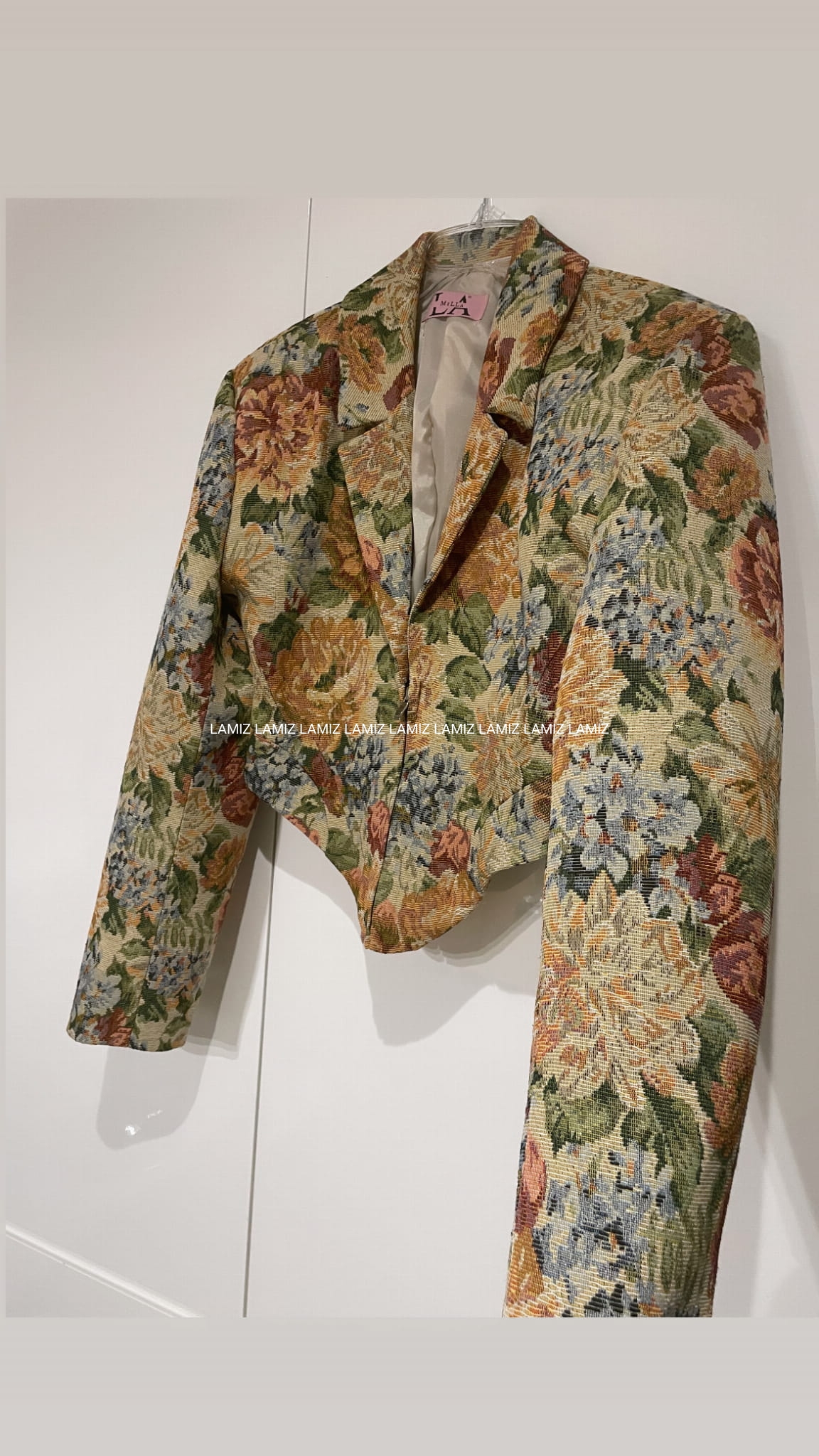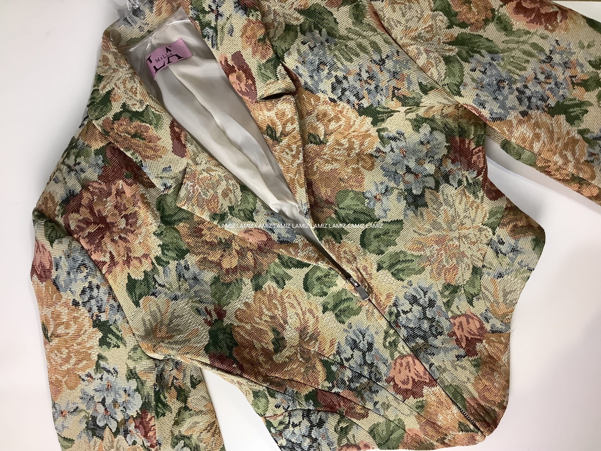 Żakardowa marynarka w kwiatowy print to elegancka i kobieca propozycja, która łączy klasykę z wyrazistym wzorem. Wykonana z wysokiej jakości materiału o strukturze żakardu, prezentuje się luksusowo i efektownie. Marynarka posiada zapięcie na guziki, duże praktyczne kieszenie oraz wiązania w talii, które pozwalają dopasować fason do sylwetki, podkreślając kobiece kształty. Kwiatowy print nadaje całości świeżego, modnego charakteru, dzięki czemu marynarka świetnie sprawdzi się zarówno w stylizacjach casualowych, jak i bardziej eleganckich