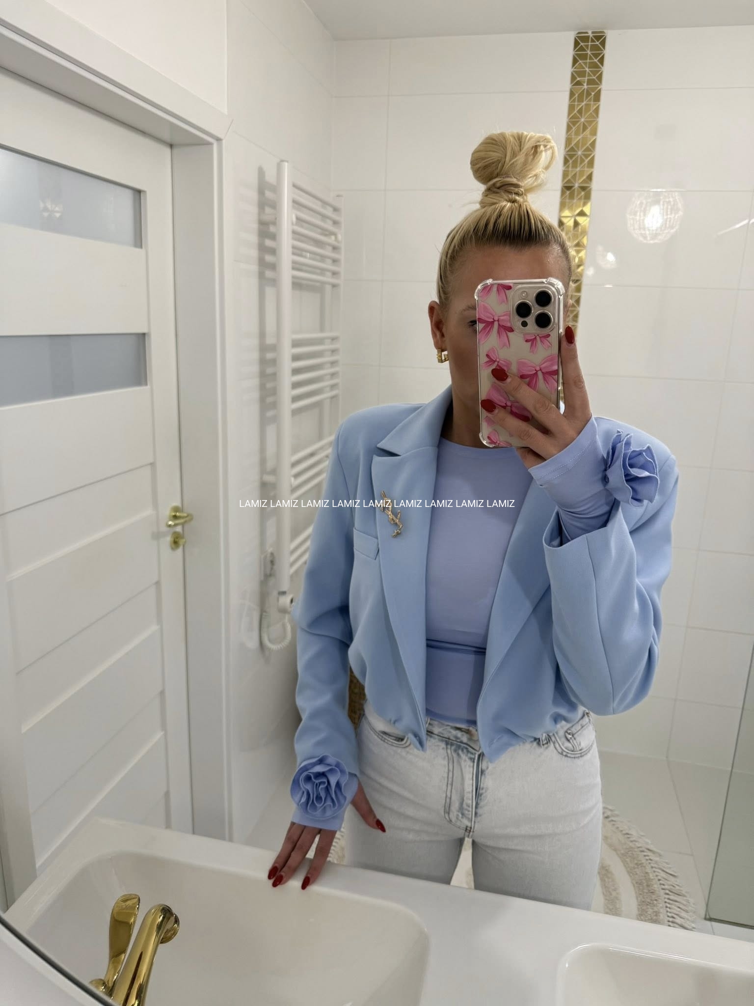 Obłędnie piękna marynarka w stylu bomberki z delikatnymi poduszkami na ramionach. Krój do pasa z gumką u dołu. Podszewka, ozdobny kołnierz + broszka GRATIS! Lekka, absolutnie wyjątkowa i uniwersalna. Wykorzystasz ja do sukienek podkreślając talię oraz do jeansów czy spódnico-szortów. Jakość PREMIUM. Polskie szycie.