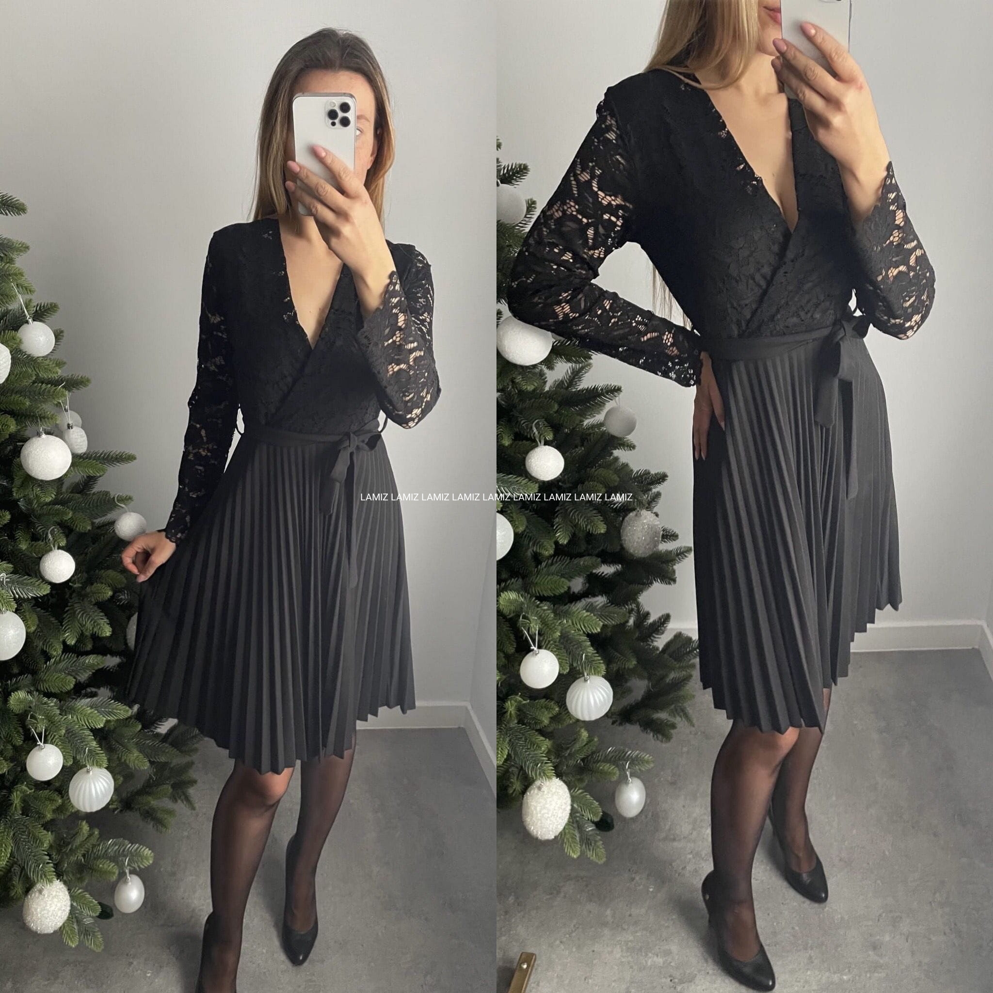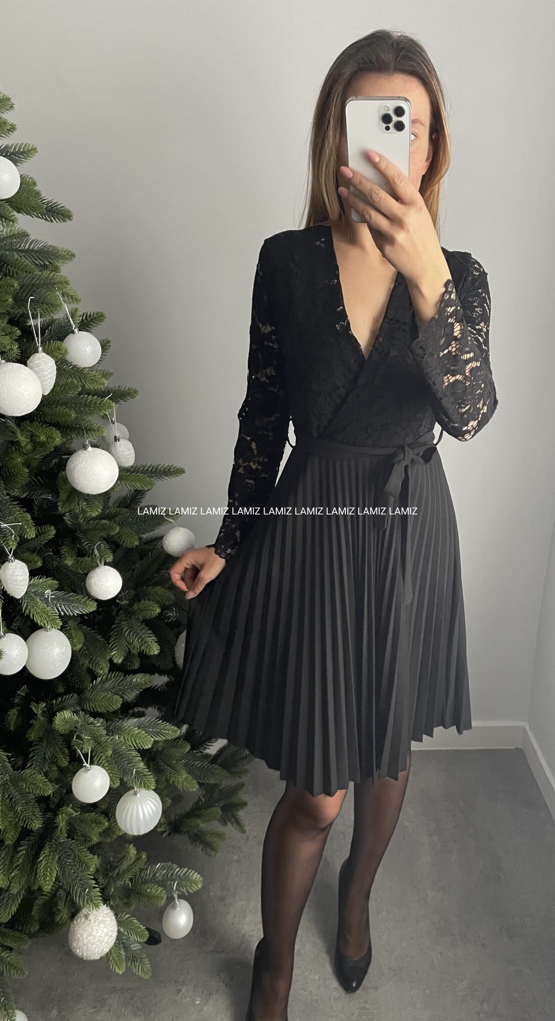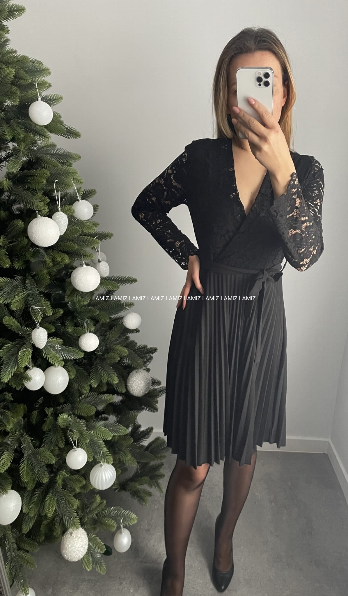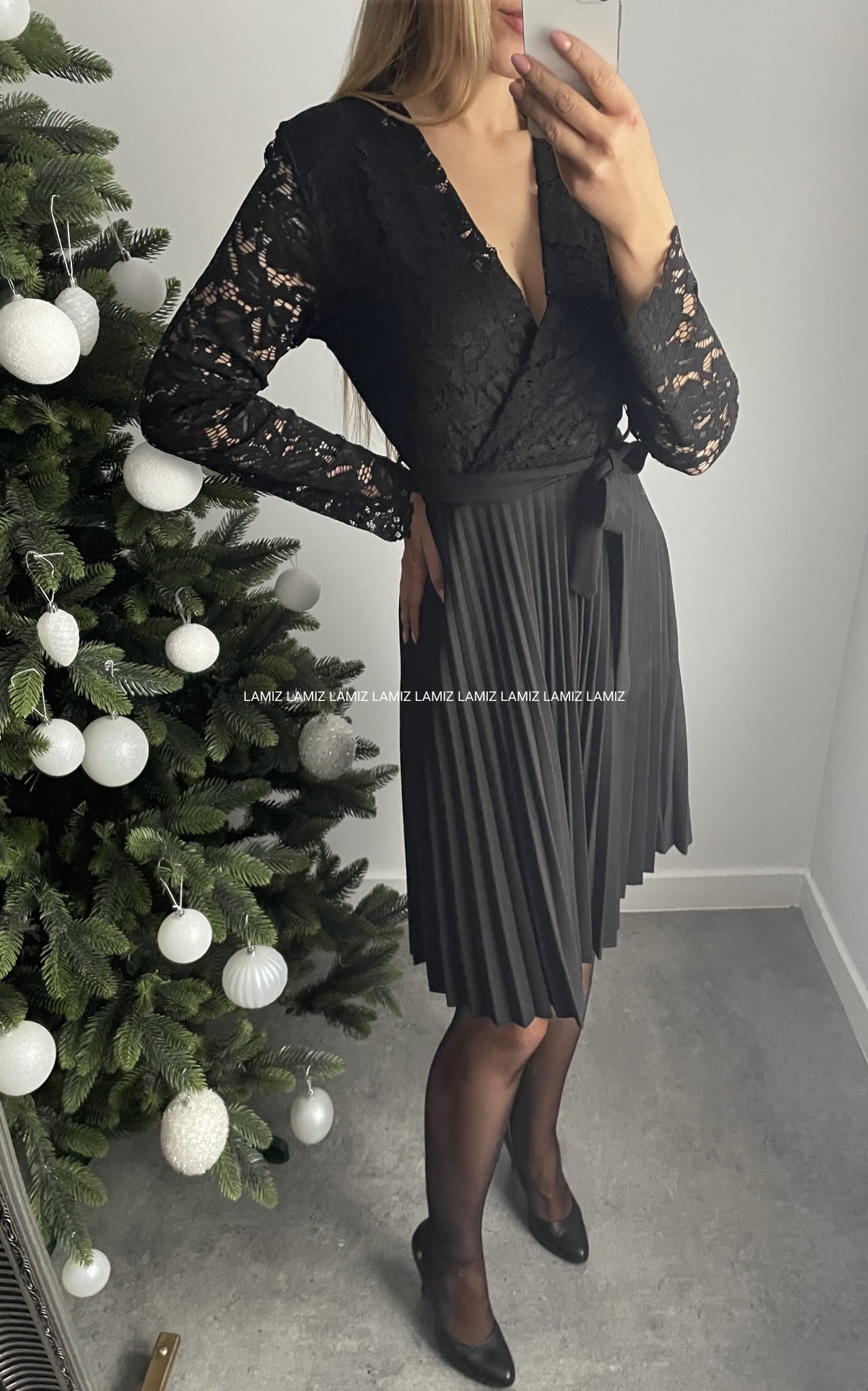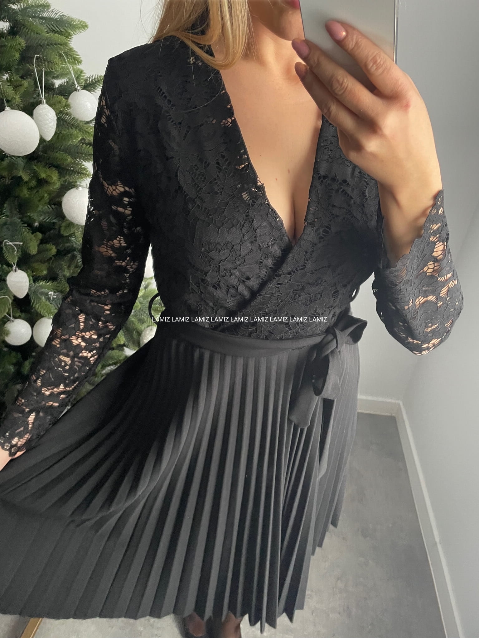 Koronkowa sukienka z głębokim dekoltem na zakładkę to doskonała baza do wielu eleganckich stylizacji. Model w talii posiada elastyczną gumkę oraz pasek . Lekko prześwitujące rękawy nadają całości zmysłowego wyglądu oraz plisowany dół.