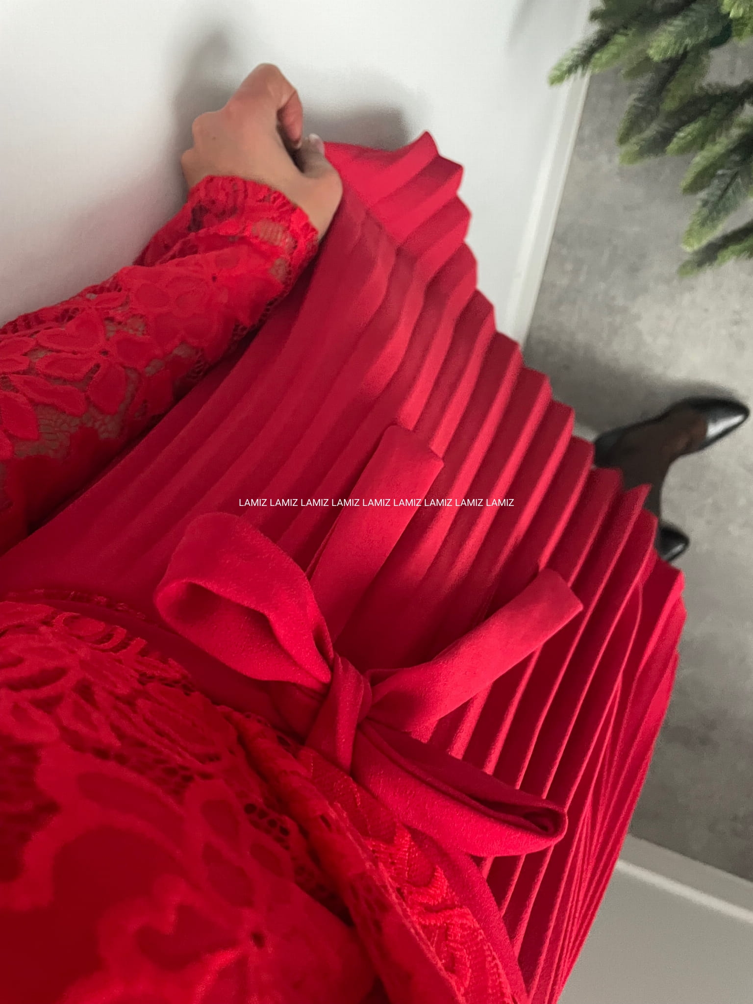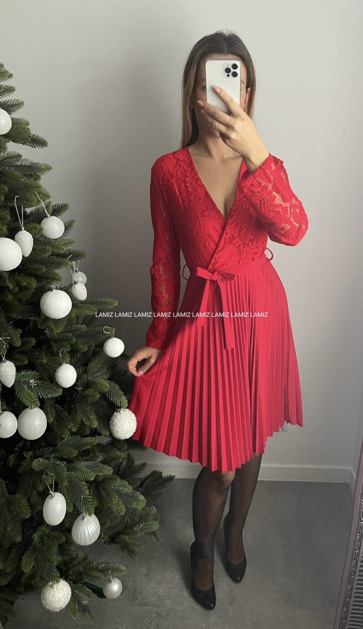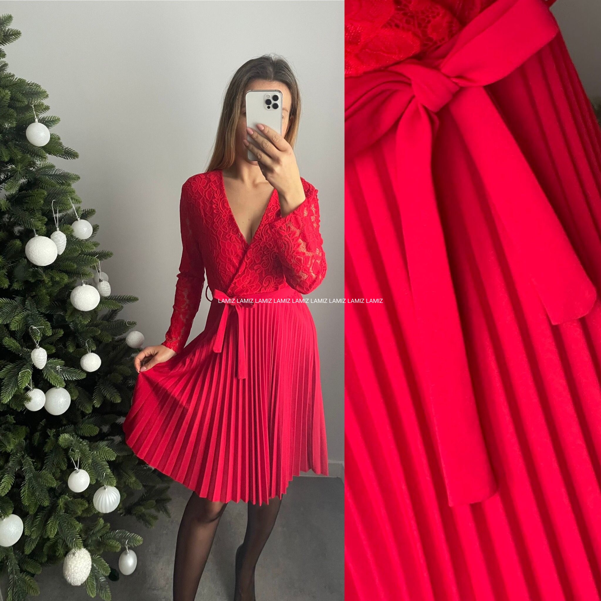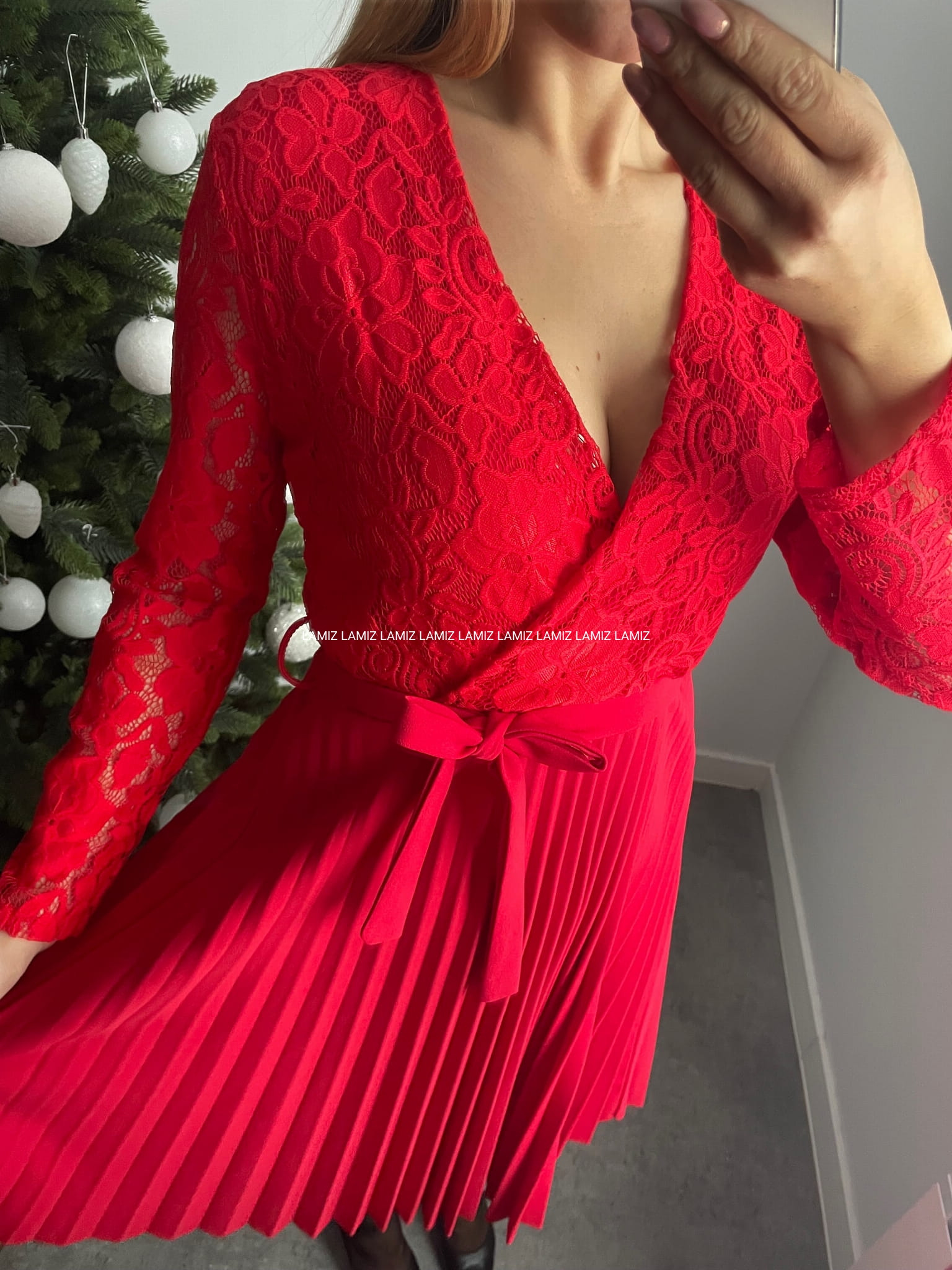 Koronkowa sukienka z głębokim dekoltem na zakładkę to doskonała baza do wielu eleganckich stylizacji. Model w talii posiada elastyczną gumkę oraz pasek . Lekko prześwitujące rękawy nadają całości zmysłowego wyglądu oraz plisowany dół.