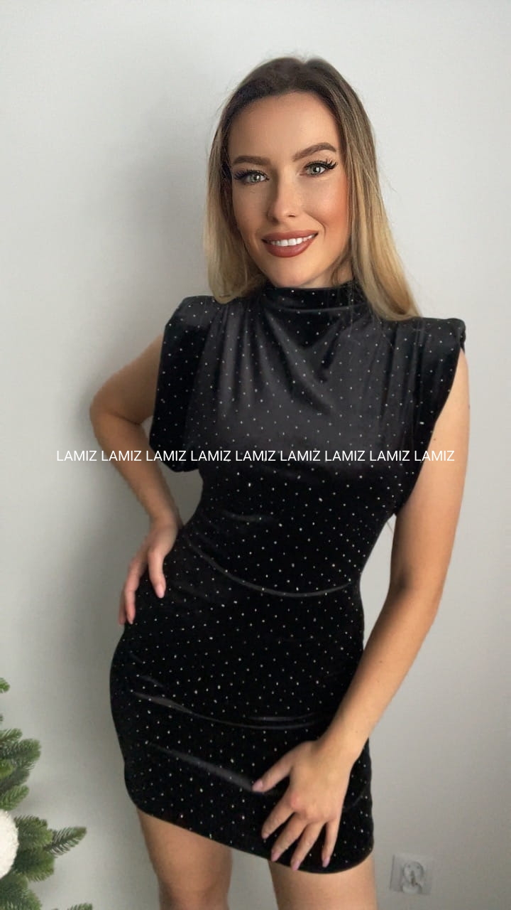 Piękna welurowa sukienka zdobiona błyszczącymi cyrkoniami. Posiada stójkę oraz szerokie krótkie rękawy z poduszkami w ramionach. Idealna sukienka na wyjątkowe okazje.