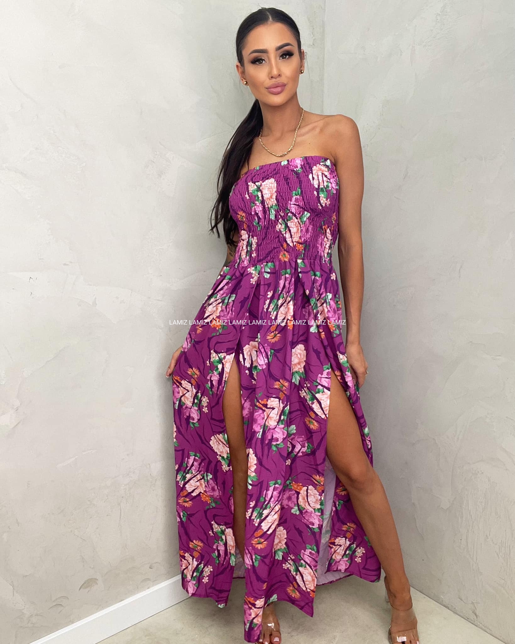 Sukienka dubaj maxi letnia fioletowa w kwiaty z rozcięciami