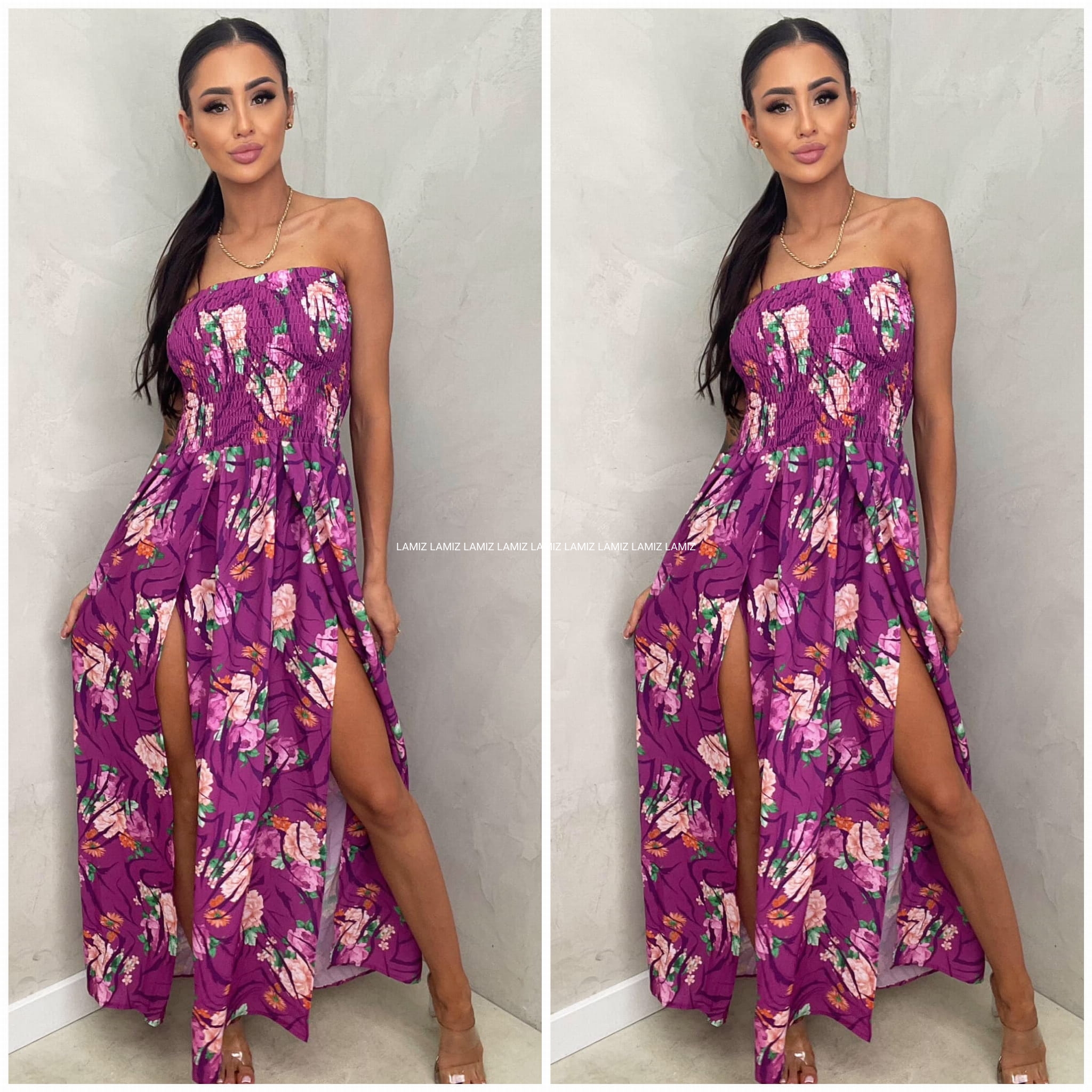 Wyjątkowa sukienka z marszczoną górą to doskonały wybór na wiele okazji. Model bez ramiączek ,dzięki czemu idealnie dopasowuje się do sylwetki i utrzymuje na miejscu. Całość jest niezwykle zwiewna i lekka, to świetna baza do wygodnych stylizacji, Materiał w różnej kolorystyce i printach kwiatowych z cienkiego materiału. Sukienka z rozcięciami na nogę.
