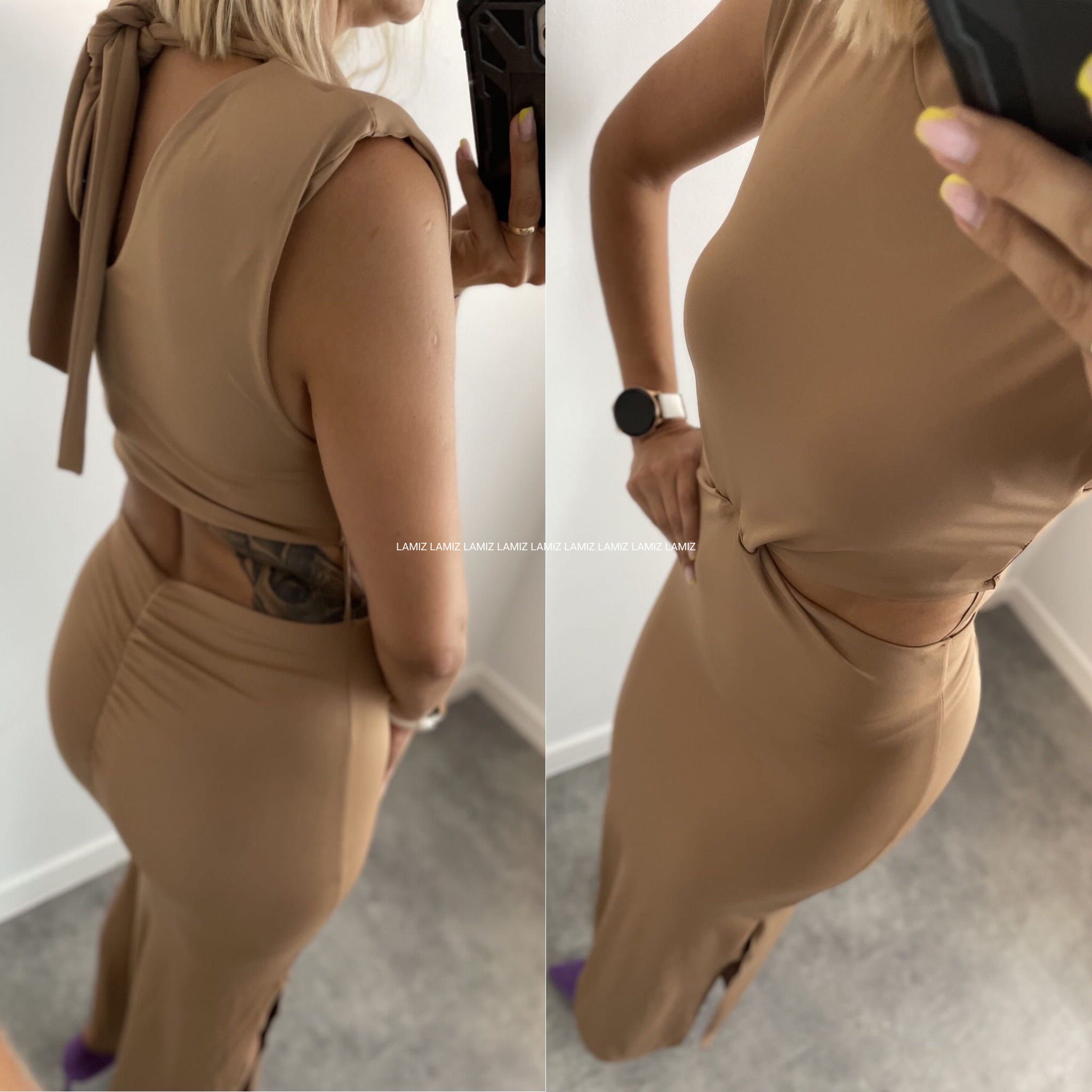 Sukienka maxi dopasowana beż impreza z rozcięciem na nodze