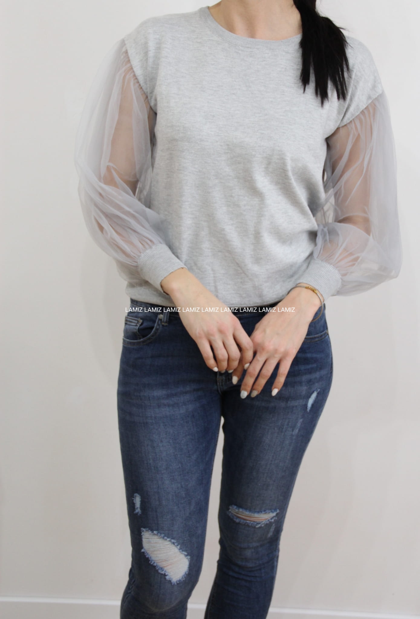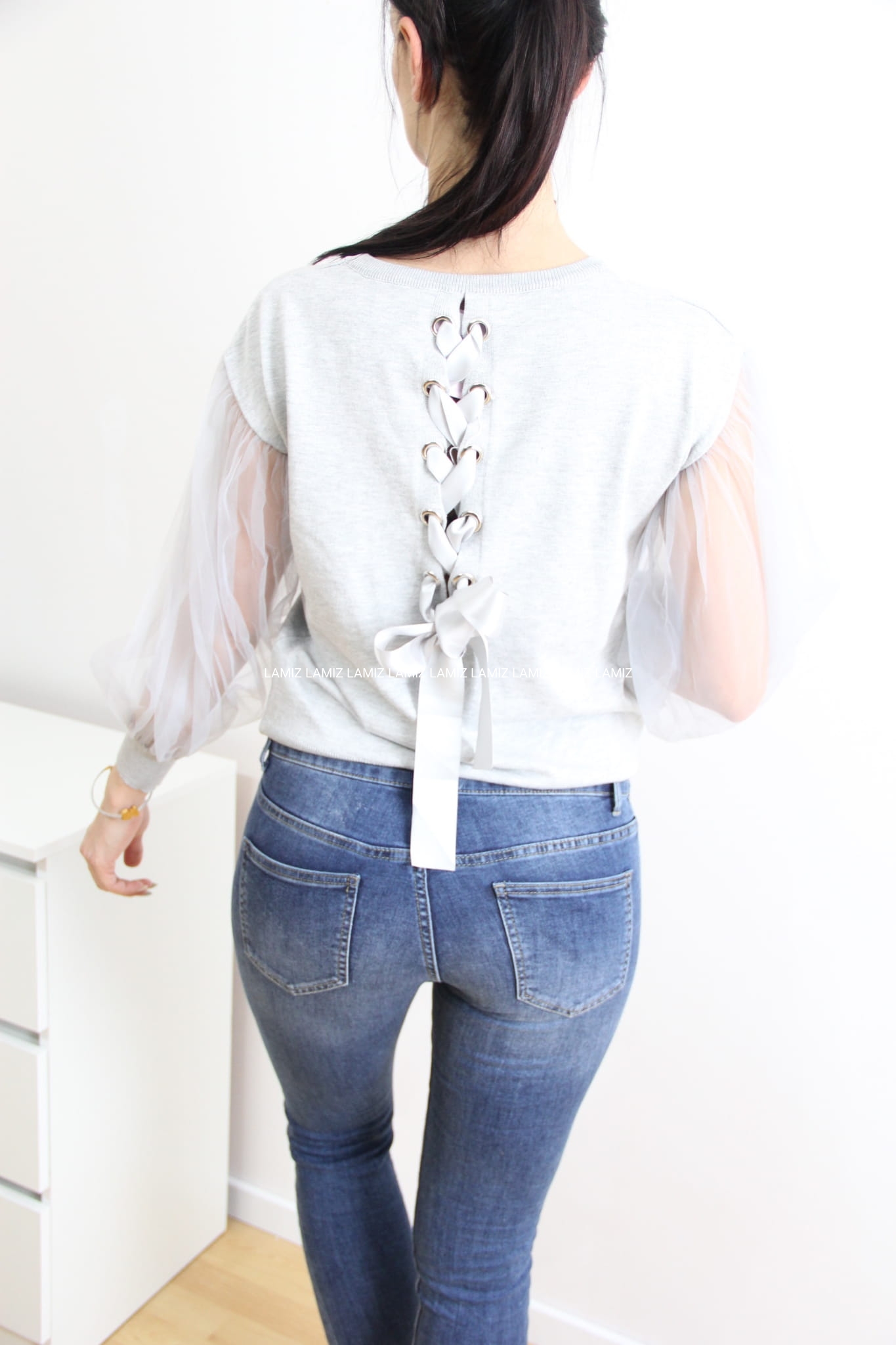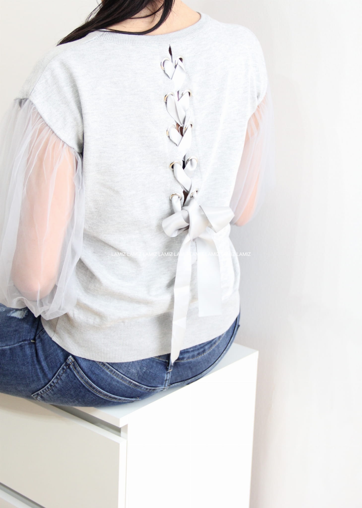 Sweterek szary z tiulowymi rękawami kokarda