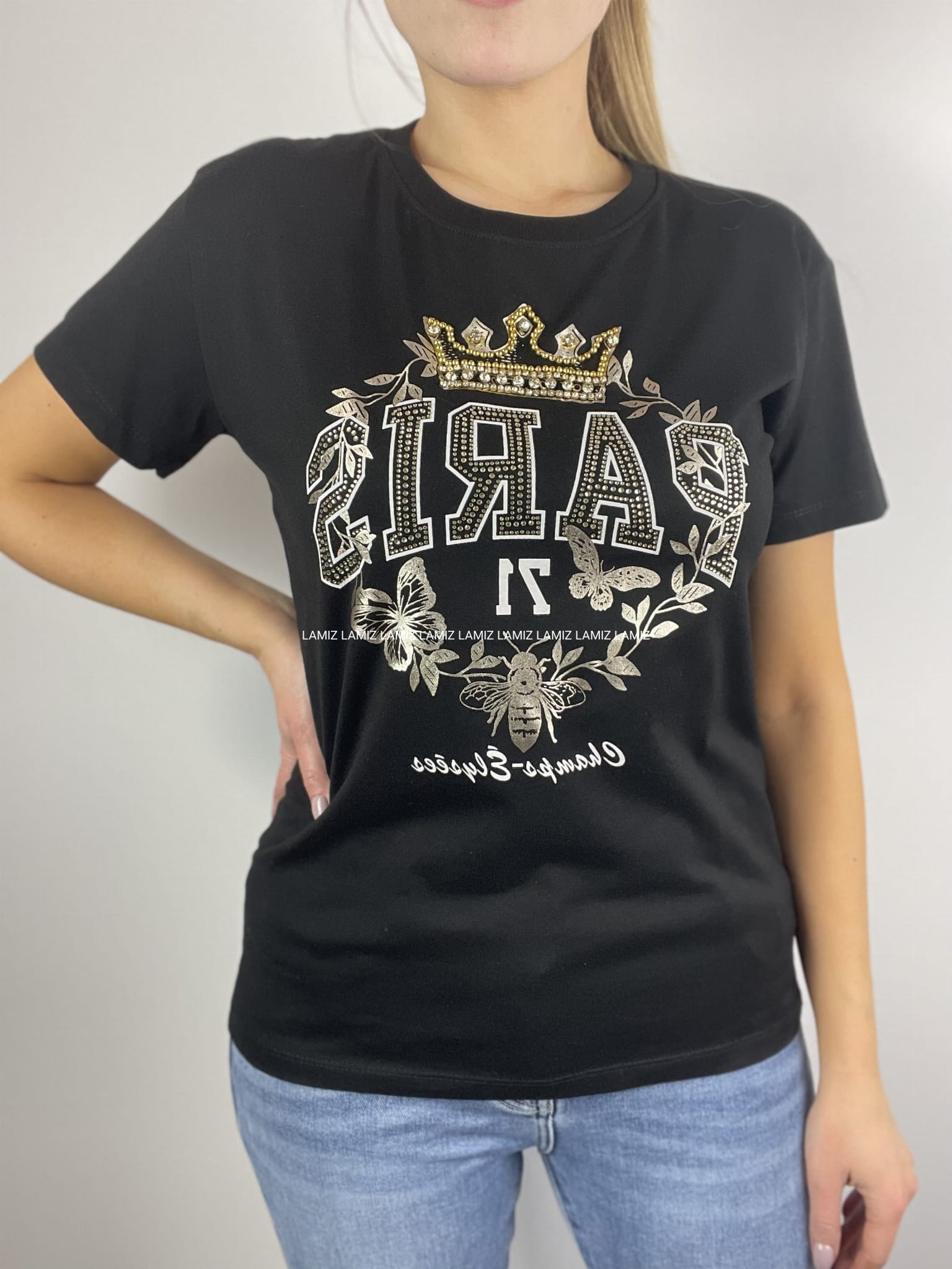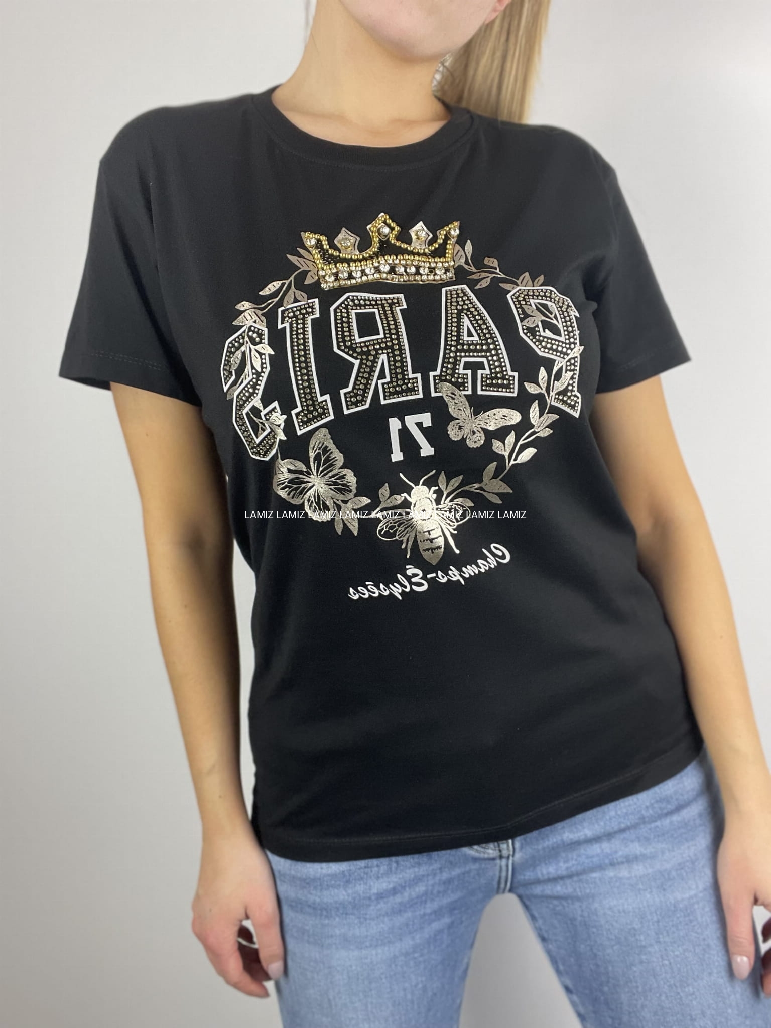 Klasyczny bawełniany czarny t-shirt z błyszczącą aplikacją. Wykonany z wysokiej jakości materiału, zagwarantuje Ci komfort noszenia i swobodę ruchów. Idealny do jeansów. Materiał elastyczny.
