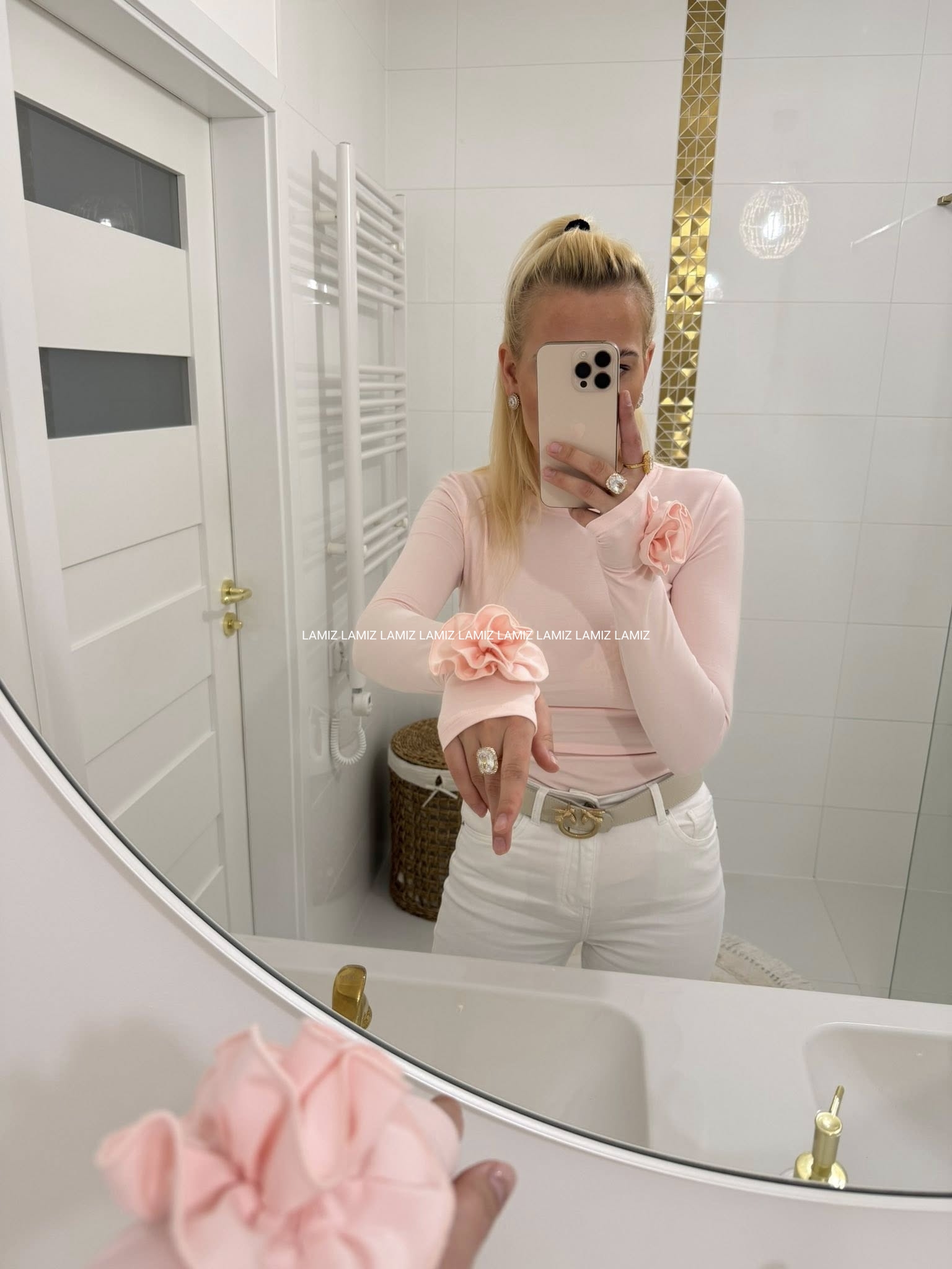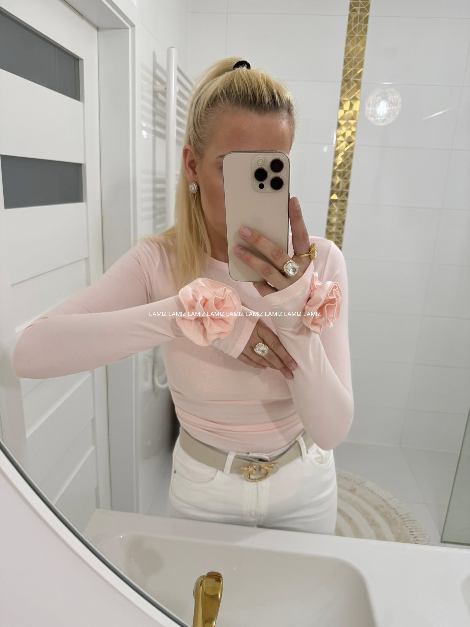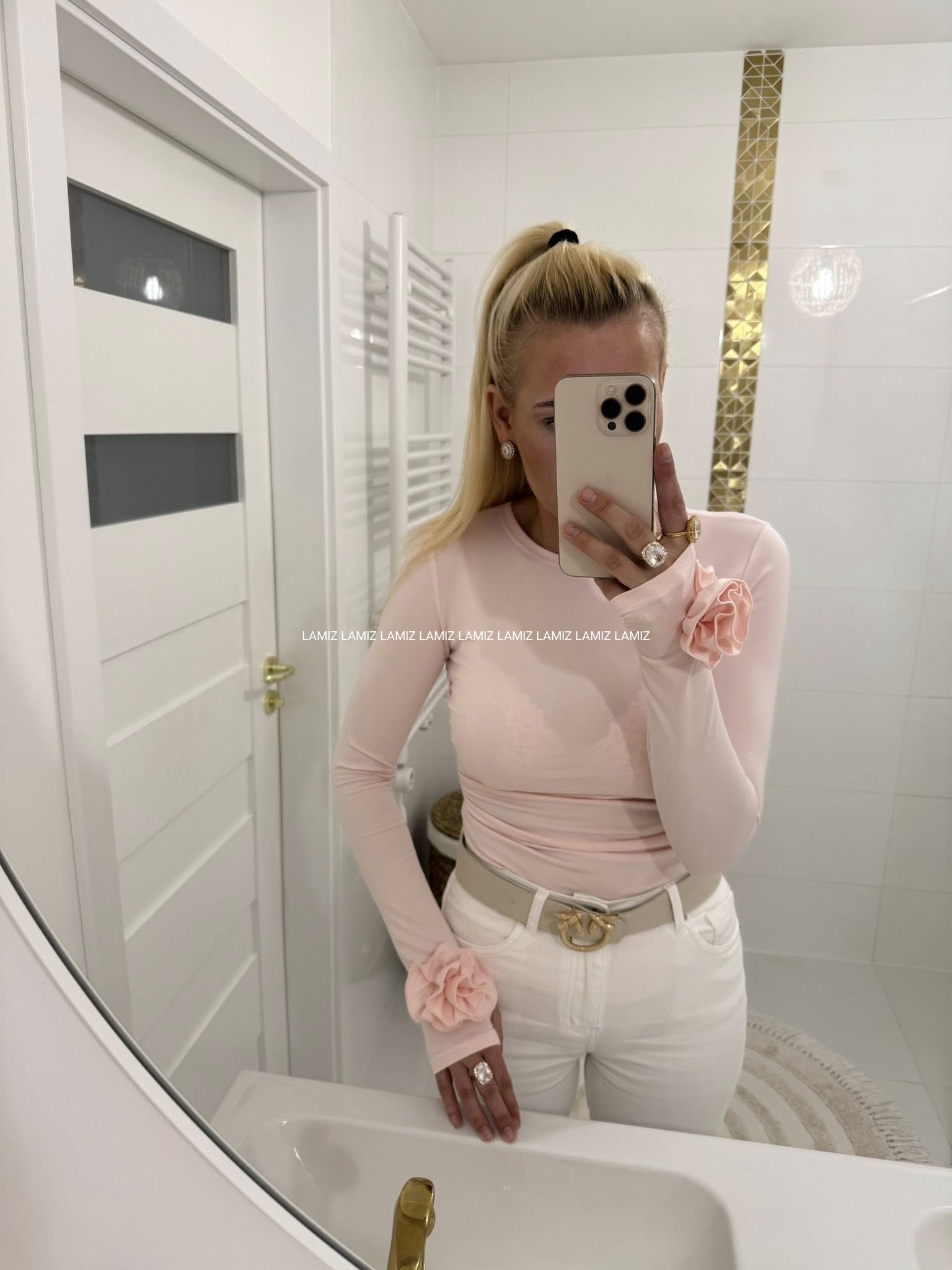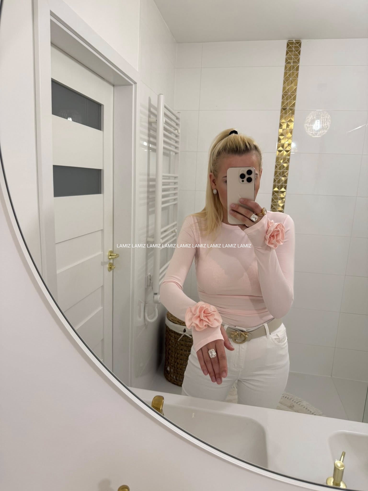 Obłędnie kobieca, elegancka i ekskluzywna bluzka od polskiego producenta w jakości premium z marszczeniem na brzuchu maskującym niedoskonałości. Materiał elastyczny, miękki w dotyku i dobrze dopasowany. Rękawy gładkie, wiskozowe z różyczkami oraz dziurką na kciuk.