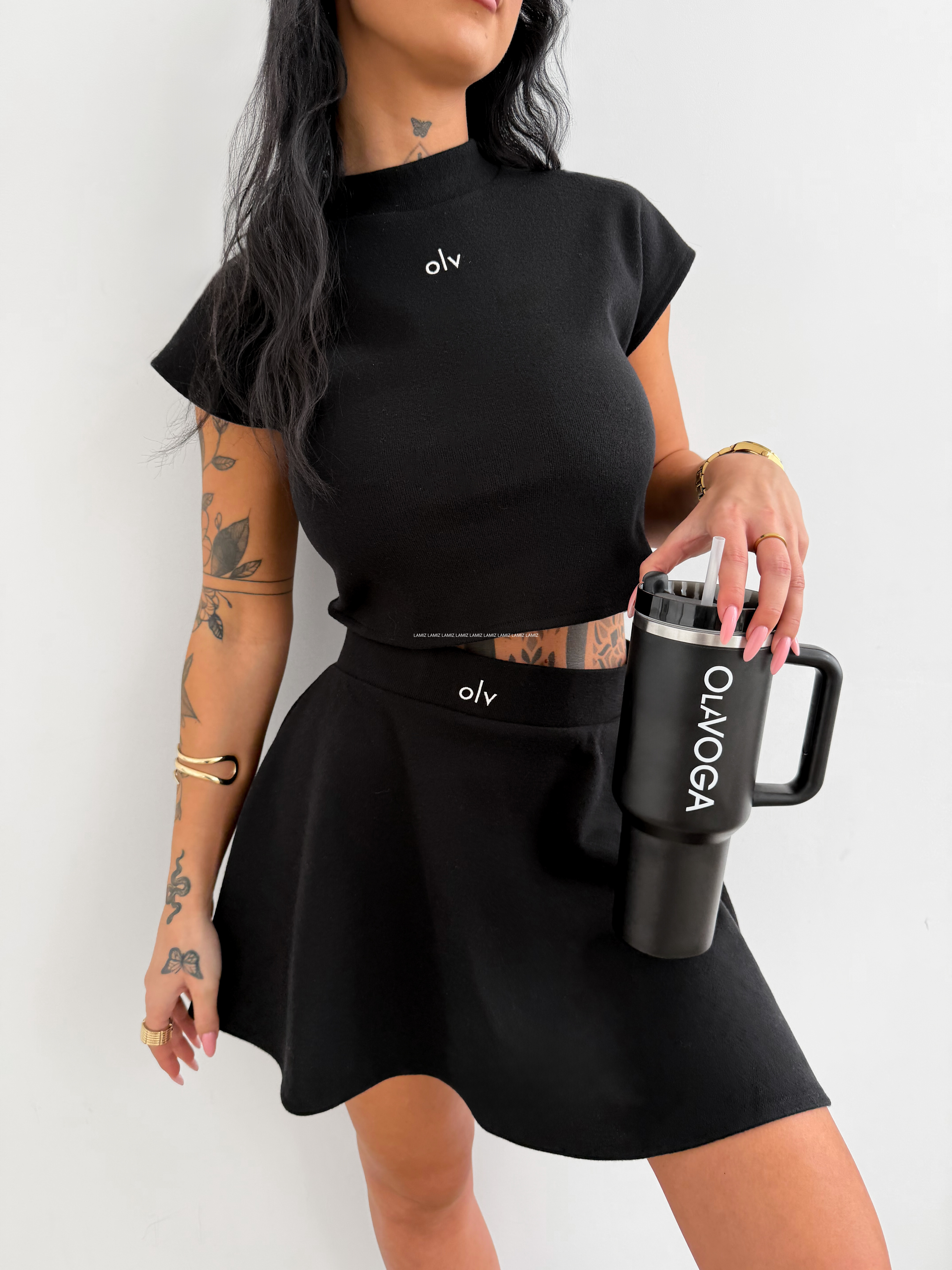 Komplet letni OLAVOGA, top o skróconym kroju - krótki rękaw z wyraźnie zaznaczona linia ramion - dekolt ze stójką - na przodzie subtelne haftowane logo w kontrastowym kolorze - spódnica o lekko rozkloszowanym fasonie - długość mini - subtelny haft OLV w pasie - wysokogatunkowa dzianina