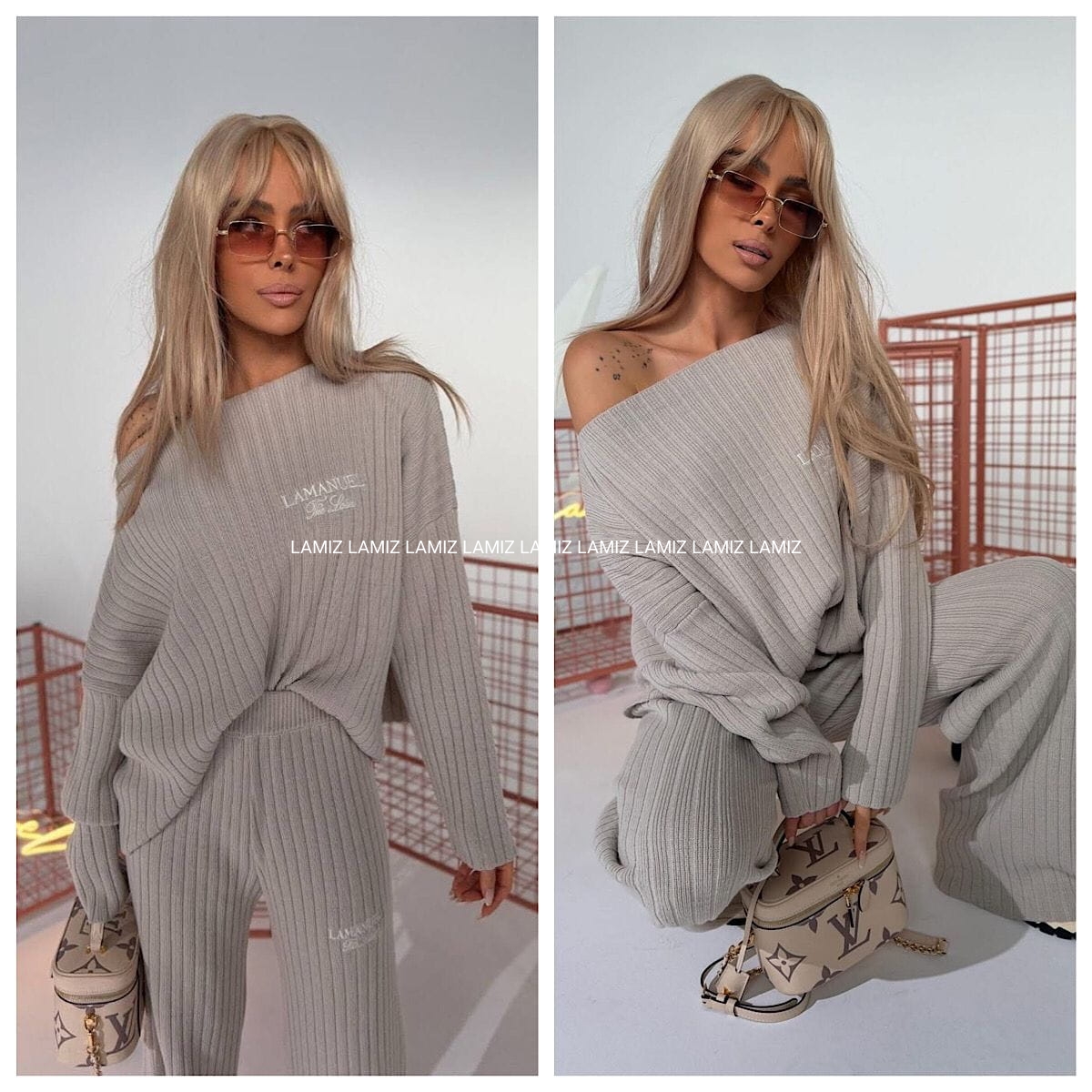 Dzianina o wyraźnym, pionowym prążku – miękka, elastyczna, dobrze układająca się w ruchu. Góra z opuszczoną linią ramion, szerokim rękawem i lekko oversize’owym krojem. Można nosić klasycznie lub opuścić na jedno ramię. Spodnie z wysokim stanem i prostą nogawką. Pas szeroki, elastyczny – bez widocznych sznurków czy zapięć. Na piersi i biodrze haftowane logo w minimalistycznym stylu. Całość tworzy sylwetkę, ale nie opina. Miękkość dzianiny + struktura prążka = zestaw, który nie wygląda jak homewear, ale nosi się jak homewear.