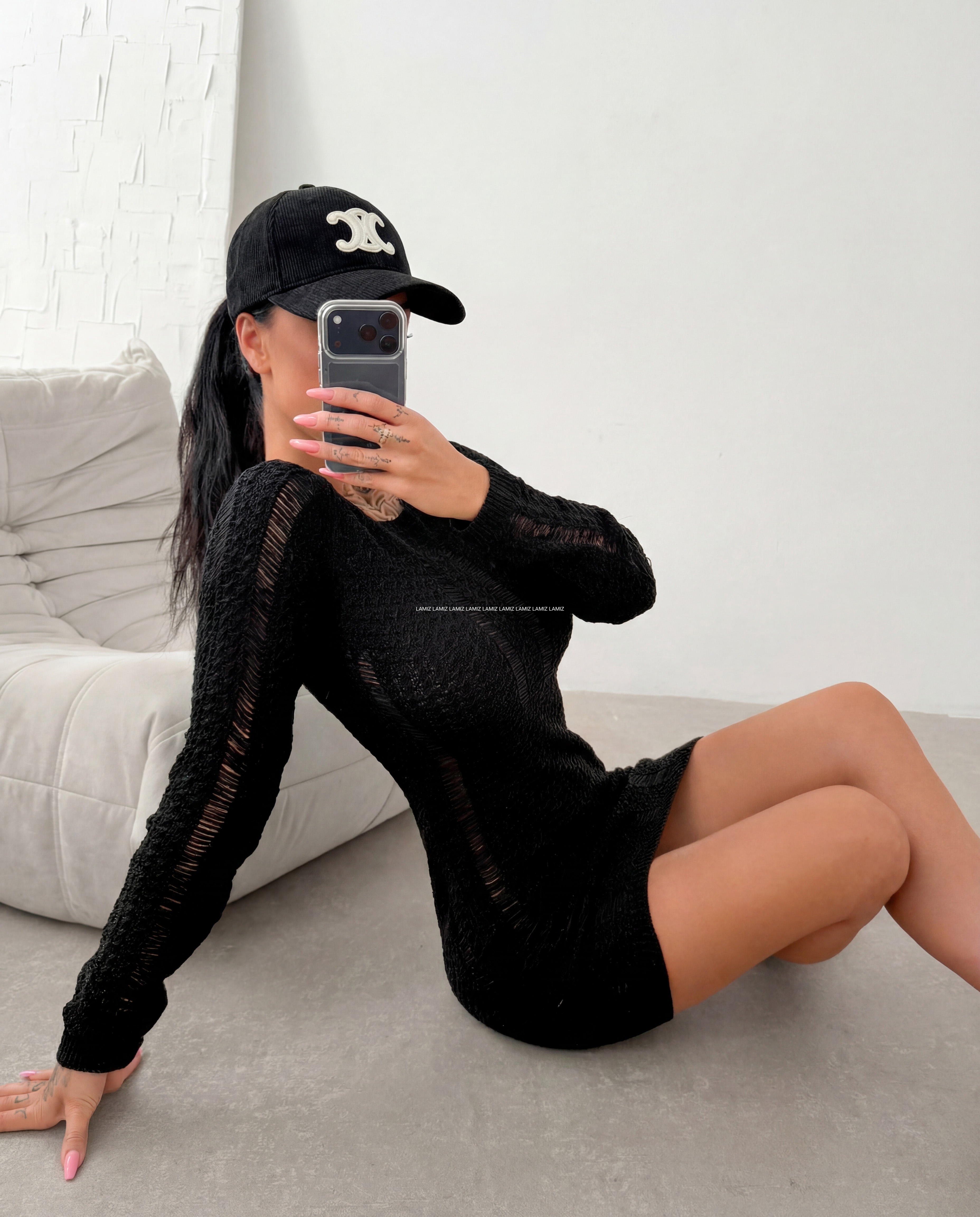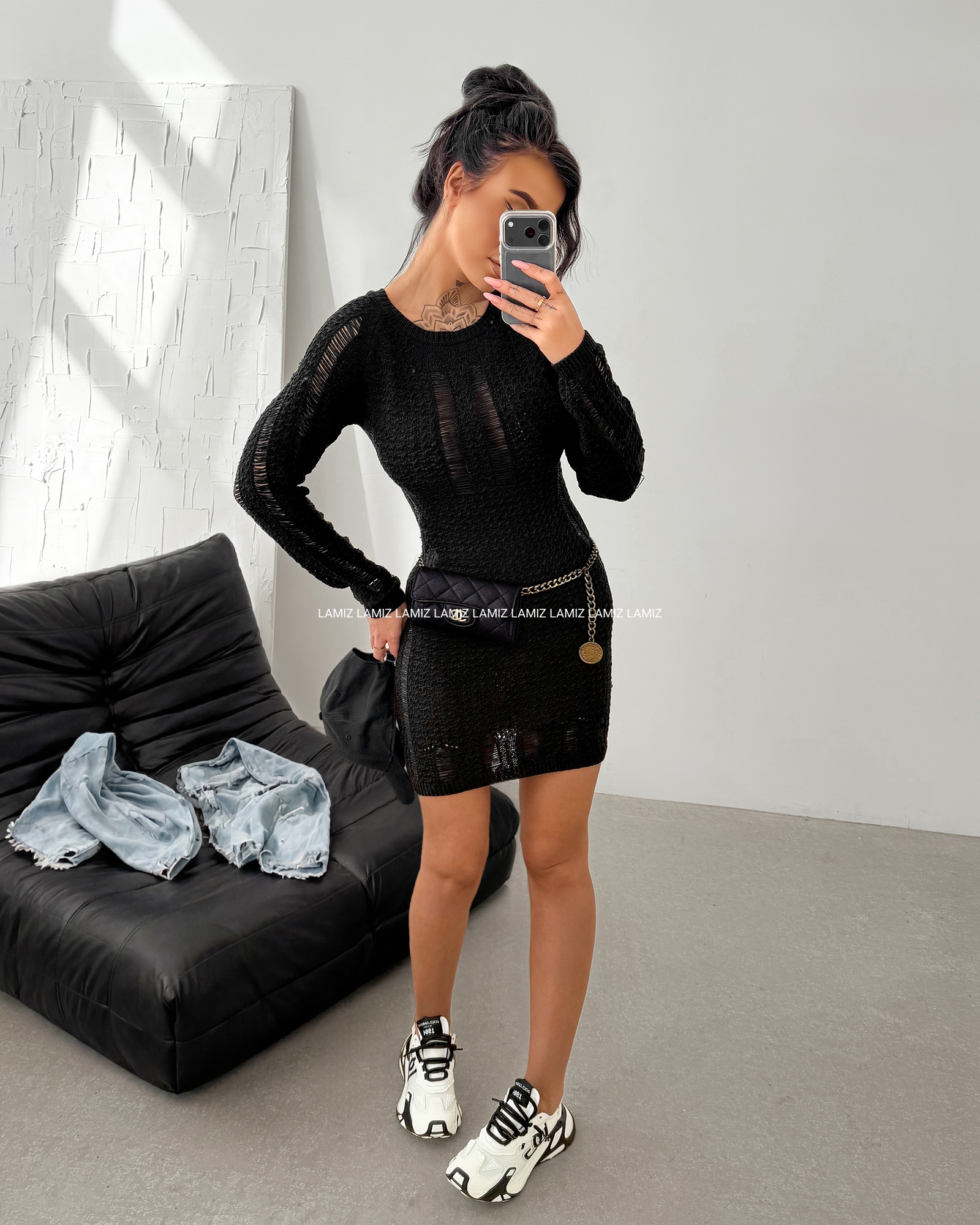 Sukienka OLAVOGA, dopasowany fason - długi rękaw - klasyczny zabudowany dekolt - ażurowa strukturalna faktura dzianiny - kontrolowany distressed look na całej sukience.
